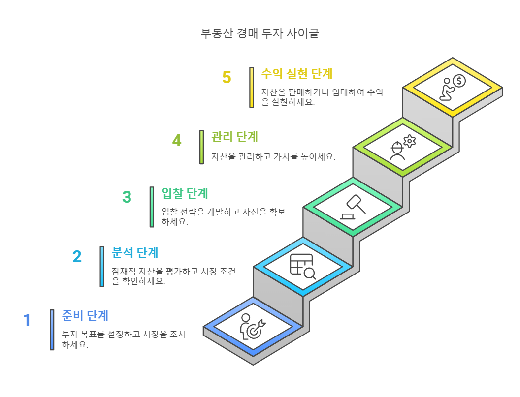 경매 투자 사이클은 물건 탐색부터 낙찰, 관리, 그리고 수익 창출까지 이어지는 체계적인 흐름이에요.
