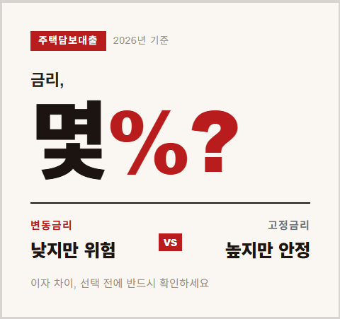 2026년 주택담보대출 금리 범위를 최신 기준으로 정리했습니다. 변동·고정 금리 차이, 0.5%p 이자 차이 계산, 금리 선택 전략과 인상 리스크까지 실행 직전 판단 기준을 안내합니다.