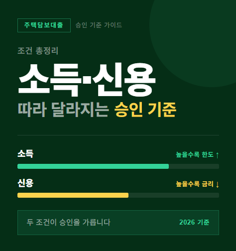 주택담보대출 승인 조건을 2026년 최신 기준으로 정리했습니다. 직장인·사업자·외국인 승인 차이, 신용점수 영향, DSR/LTV 규제, 거절 원인과 승인 확률 높이는 실전 전략까지 안내합니다.
