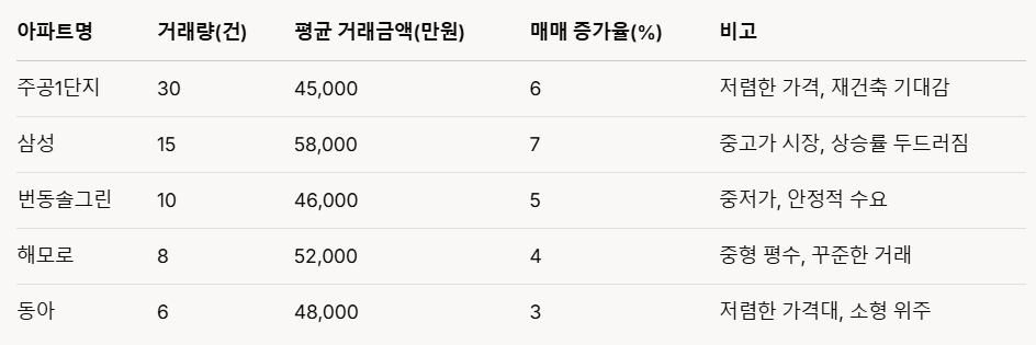 분석: "주공1단지"가 거래량 1위, "삼성"이 매매가 증가율 7%로 상승률 1위. 중저가 단지와 재건축 기대감이 두드러짐.