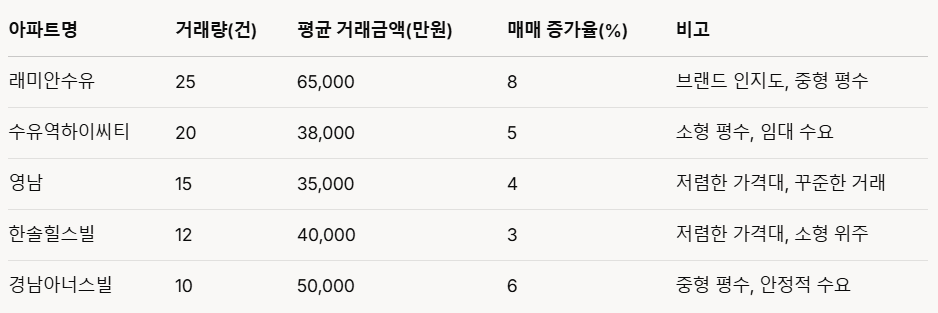 분석: "래미안수유"가 매매가 증가율 8%로 1위, "수유역하이씨티"는 소형 평수로 투자 수요 강세.