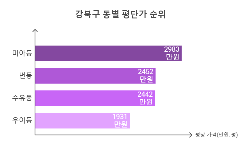 예를 들어, 평균 매매가가 높은 미아동은 강북구 내에서 최상위권을 차지하고 있죠.