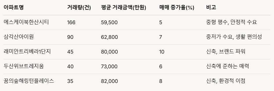 분석: "에스케이북한산시티"가 거래량 1위를 차지했으며, "래미안트리베라1단지"는 매매가 증가율 10%로 상승률 1위. 신축 단지와 브랜드 아파트가 강세.
