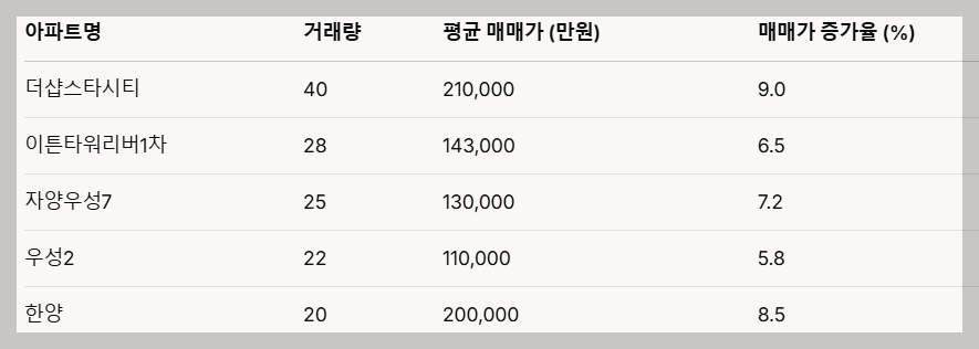- 일성파크: 12건의 거래와 5.0%의 상승률로 소규모 단지이지만 꾸준한 관심을 받고 있습니다.