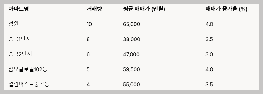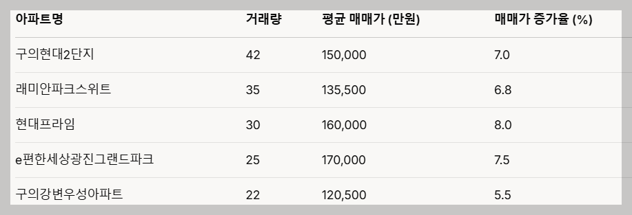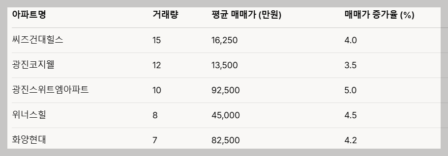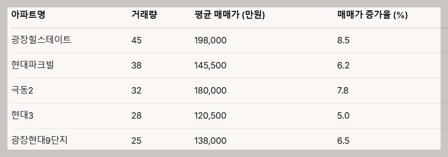 - 광장힐스테이트: 45건의 거래와 8.5%의 매매가 상승률을 기록하며 안정적인 상승세를 보이고 있습니다.